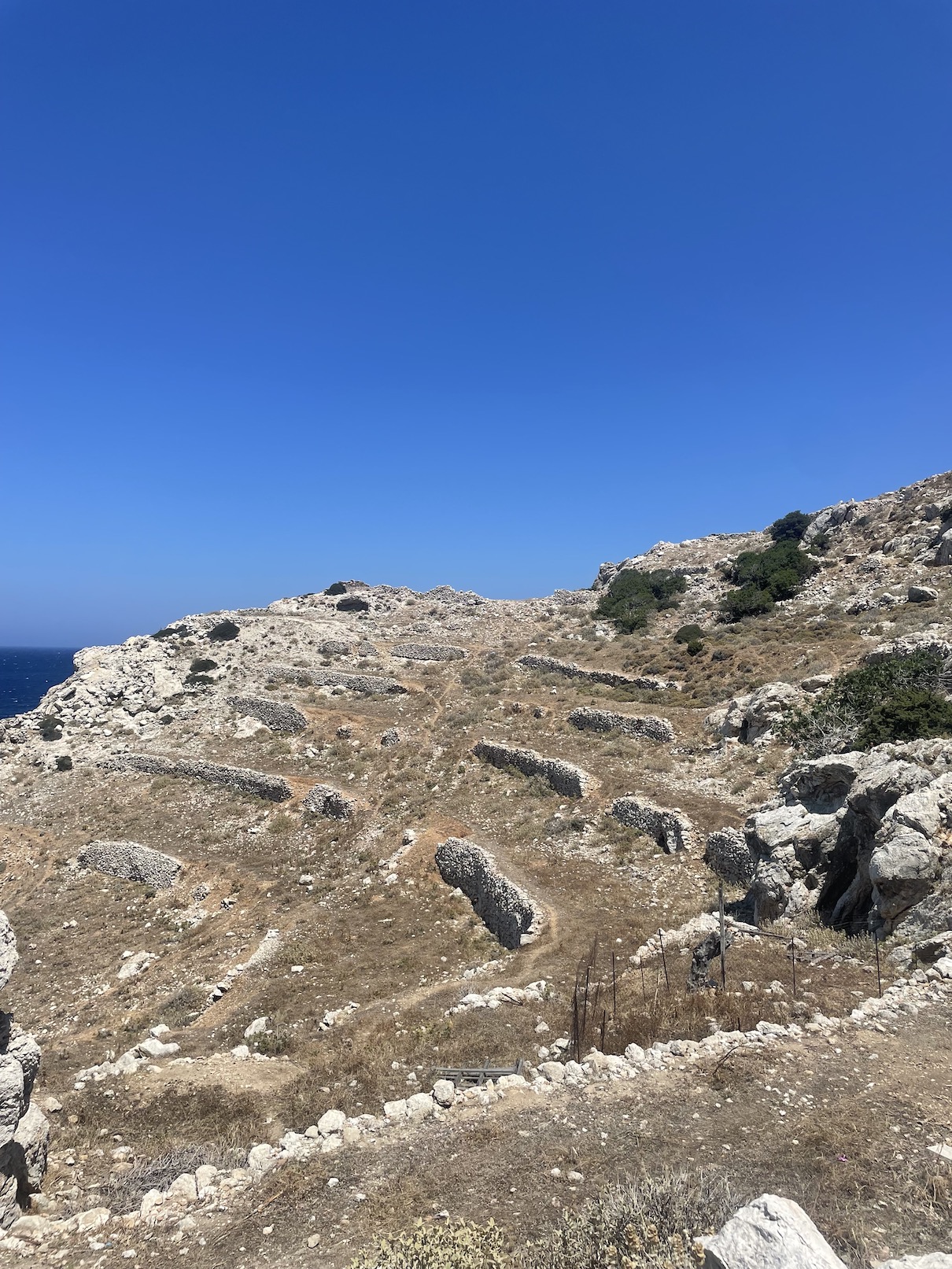 Klim je nog verder naar boven dan passeer je nog een kerkje. Boven op deze 23 meter hoge rots Vouno zijn bovendien de restanten gevonden van de Acropolis van oud Karpathos uit de Myceense tijd. Het wordt niet goed aangegeven en er staan nergens bordjes, maar een bezoek is wel de moeite waard!
