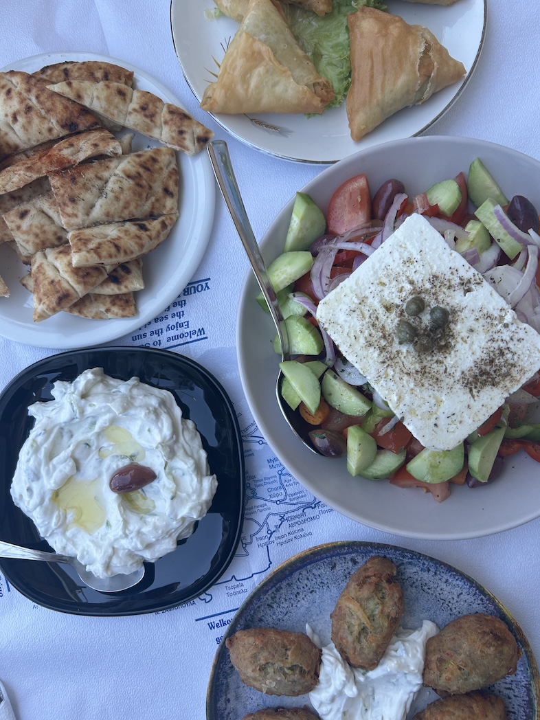 First things first. Een van de eerste dingen die ik namelijk doe als ik aankom in Griekenland is een authentiek Grieks restaurant opzoeken (het liefst eentje met blauwe stoeltjes en geblokte tafelkleedjes) en typisch Griekse gerechten bestellen, zoals Griekse salade, tzatziki, brood en een glas witte wijn.