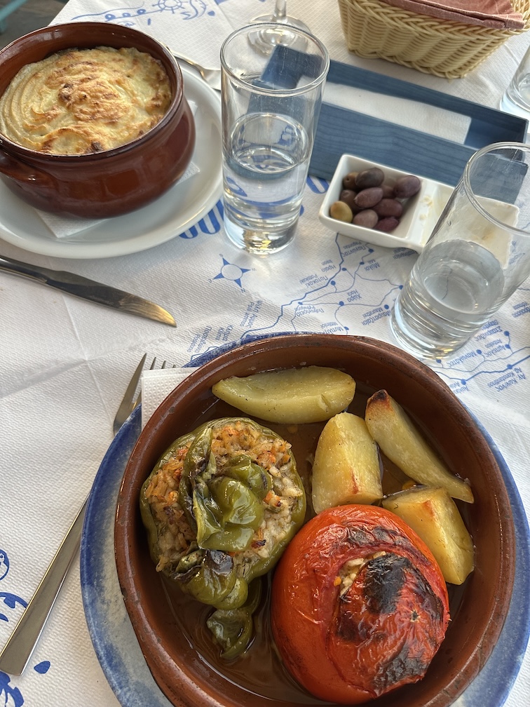 Wij aten hier een keer een typisch Griekse lunch en bestelden er gevulde tomaten en vegetarische moussaka in de avond. Nog zo’n lekkere vega optie die ze hier serveren is melitzanes papoutsakia (gevulde aubergine).