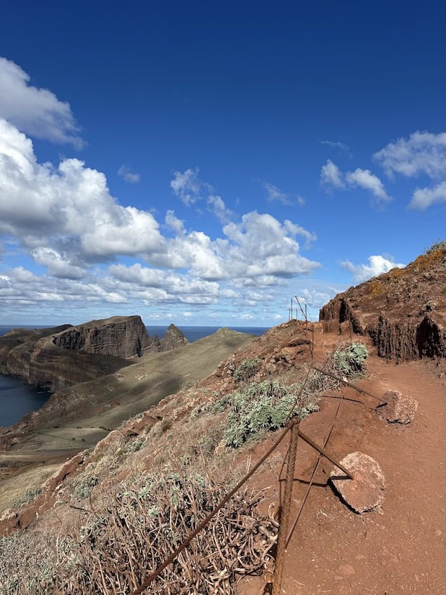 Hier, op het uiterste noordoostelijke puntje van het eiland, is nergens beschutting. En waar de rest van Madeira alle tinten groen kleurt van tropische begroeiing, vind je hier alleen maar kale rotsen in alle kleuren rood en bruin. Althans, zo lijkt het. Want hoewel het hier dor en droog lijkt, groeien er toch ongeveer 140 verschillende plantensoorten, waarvan er 31 alleen op Madeira voorkomen. Het gebied is dan ook gedeeltelijk een natuurreservaat.