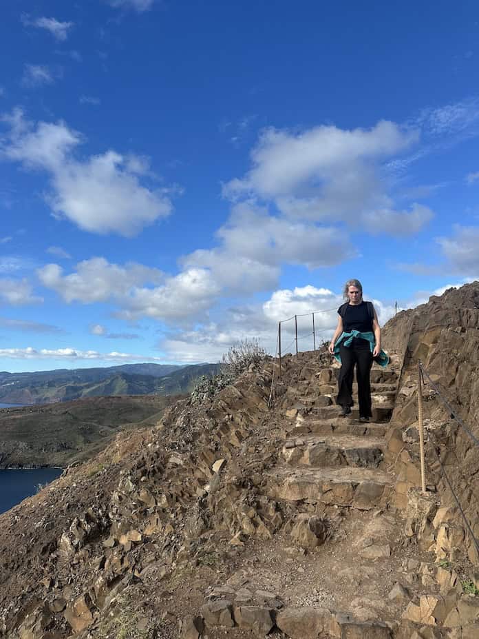 Op de PR8 is geen struikje te bekennen en wandel je soms op hoge kliffen met aan weerszijden diepe afgronden. Op veel plekken is dan wel een staalkabel gespannen, maar dat is vooral een mentale afrastering. Ik ben dan ook blij dat er niet te veel wind staat.